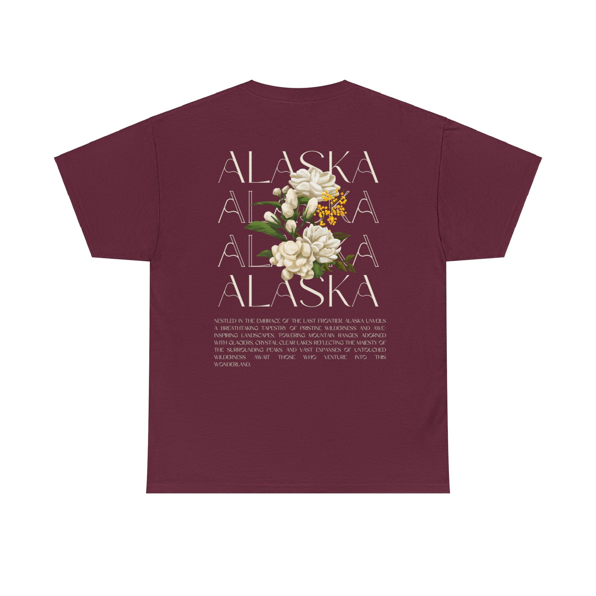 The Floral Alaska unisex heavy cotton tee is the basic staple of any wardrobe. It is the foundation upon which casual fashion grows. The specially spun fibers provide a smooth surface for premium printing vividity and sharpness. No side seams mean there are no itchy interruptions under the arms. The shoulders have tape for improved durability.